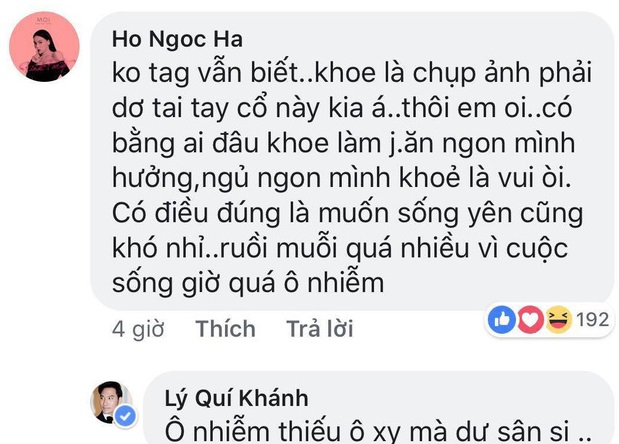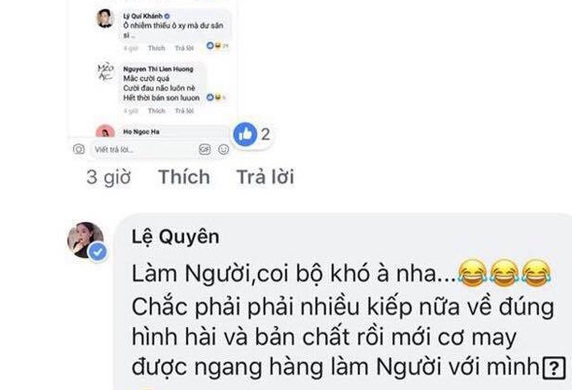 Ngay lập tức, người hâm mộ đã chụp lại đoạn trò chuyện giữa Hà Hồ và Lý Quí Khánh và bình luận gửi Lệ Quyên. Lệ Quyên cũng ngay lập tức có động thái đáp trả. Cô phản hồi: "Làm người coi bộ khó à. Chắc phải tu nhiều kiếp về đúng hình hài, bản chất rồi mới cơ may được ngang hàng làm người với mình".