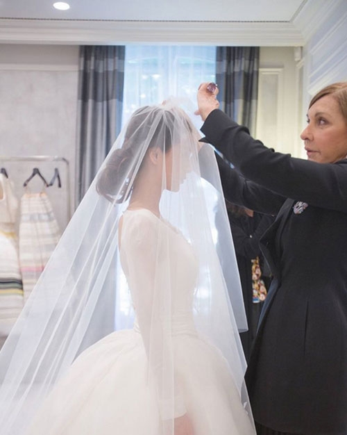 | Chiếc váy vốn dĩ đã lộng lẫy càng trở nên long lanh thêm bội phần nhờ chiếc khăn voan trùm đầu đơn giản nhưng vô cùng thanh lịch, thuần khiết. |