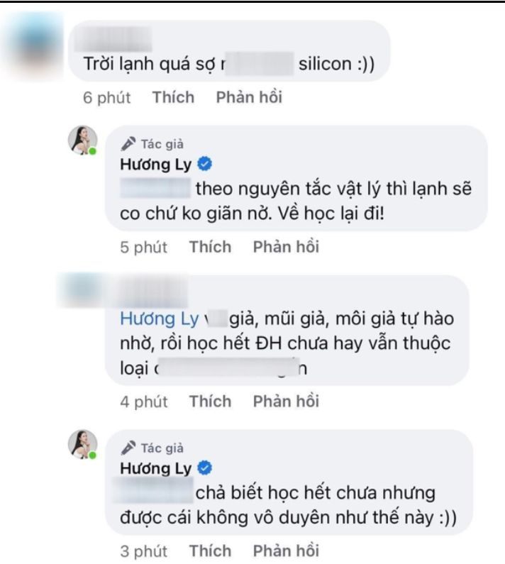 Ngay lập tức, Á hậu 1 Miss Universe Vietnam 2023 liền đáp trả: "Theo nguyên tắc vật lý thì lạnh sẽ co chứ không giãn nở. Về học lại đi".