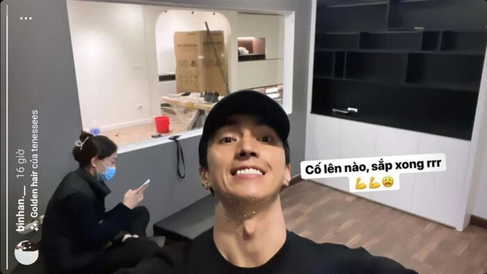 Trước đó không lâu, diễn viên Bình An cũng đăng ảnh khoe nhà mới mà anh đang trong quá trình hoàn thiện. Đặc biệt trong ảnh còn có sự xuất hiện của bạn gái Bình An - Á hậu Bùi Phương Nga. Có thể thấy, trong khi Bình An chụp ảnh thì Phương Nga tập trung với việc riêng. Chính vì vậy nhiều người cho rằng có phải cả hai đăng chăm chút cho không gian riêng, sắp về chung một nhà.