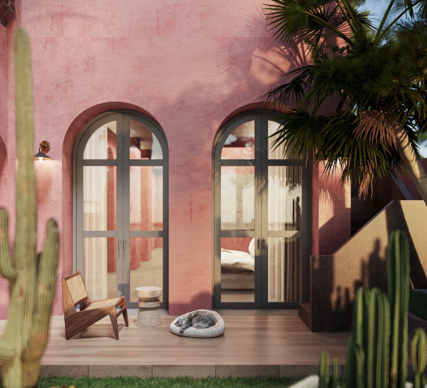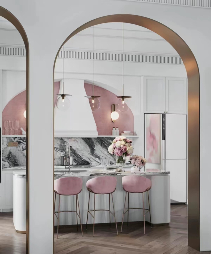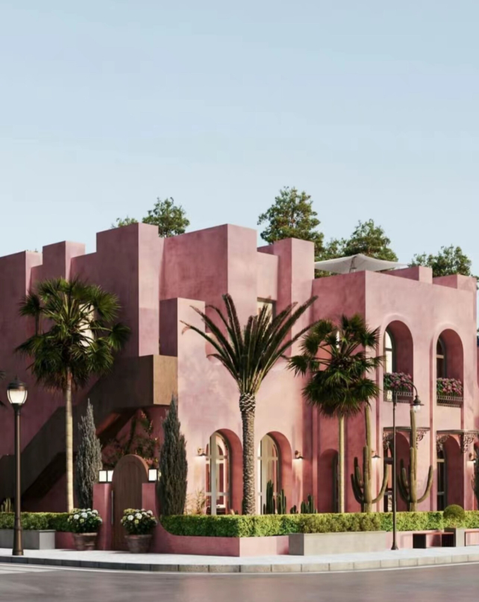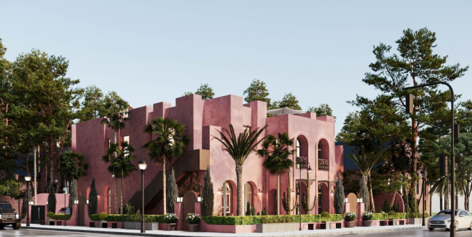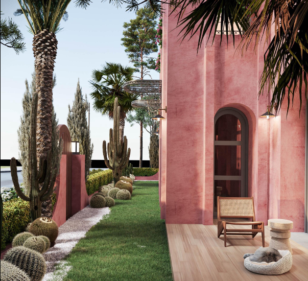 Biệt thự chọn tone hồng làm chủ đạo với 2 tầng riêng biệt. Số lượng lớn cửa và cửa sổ thiết kế hình mái vòm mềm mại vừa tạo sự kết nối với thiên nhiên ngoài khu vườn xanh ấn tượng, vừa thể hiện được phong cách và gu thẩm mỹ của nữ chủ nhân căn nhà.
