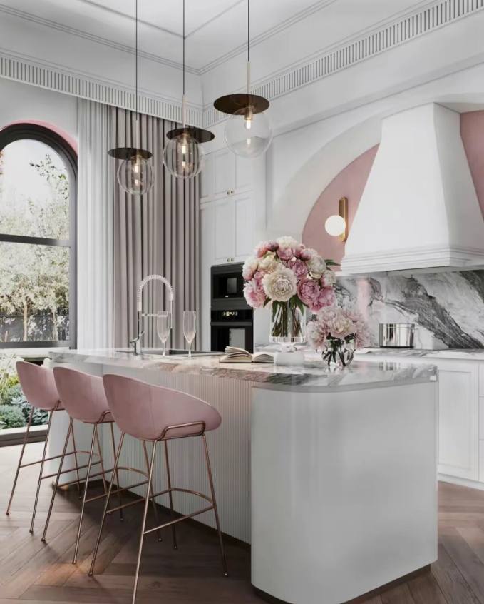 Phòng khách, đảo bếp và khu vực bàn ăn của căn villa đều liên kết với nhau trong một không gian rộng và mở ra toàn cảnh hướng hồ bơi. Phòng khách sử dụng toàn bộ nội thất hiện đại. Hệ ghế sofa được chọn lựa kỹ càng, tuân theo tone màu chủ đạo trắng - hồng với bàn vân đá ở chính giữa khu vực tiếp khách, tổng thể tạo cảm giác sang trọng, thanh lịch mà không bị "sến sẩm" khi sử dụng quá nhiều màu hồng.