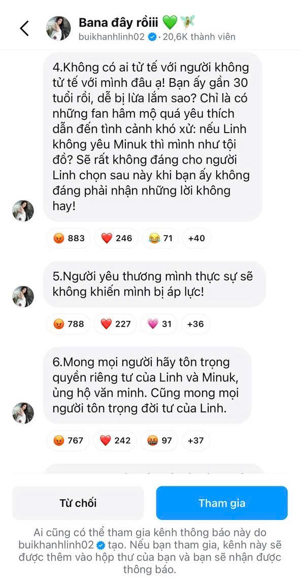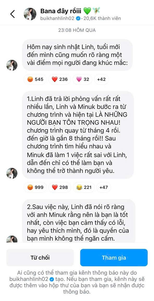 Bùi Khánh Linh chia sẻ thêm: "Sau việc này, Linh đã nói rõ ràng với anh Minuk rằng nên là bạn là tốt nhất, còn việc bạn cảm thấy có lỗi hay yêu thích mình, đó là quyền của bạn mình không thể ngăn cấm".