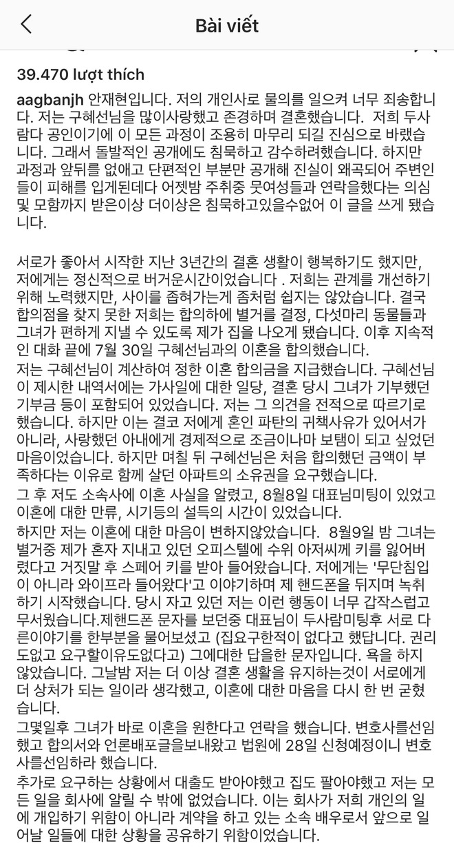 Ahn Jae Hyun còn hé lộ toàn bộ câu chuyện đằng sau việc tranh chấp nhà ở, tiền nong trong quá trình xử lý giấy tờ ly hôn. Cụ thể bức tâm thư của Ahn Jae Hyun như sau: