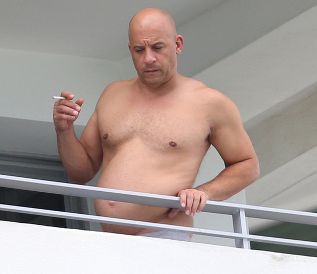 Nam diễn viên người Mỹ Vin Diesel được biết đến qua series phim bom tấn Fast And Furious. Anh nổi tiếng với ngoại hình cực ngầu và thân hình cơ bắp cuồn cuộn. Dù vậy cũng có nhiều lúc Vin lười tập thể hình và ăn uống quá đà khiến vòng 2 tăng size đột biến. Chỉ trong vài tháng nghỉ ngơi, tài tử này bỗng nhiên phát tướng khiến khán giả nhìn mãi cũng không thấy múi của anh đâu. Đúng là đốn củi 3 năm thiêu 1 giờ, luyện tập bao năm nhưng chỉ cần ăn vài hôm là mỡ lấp hết cơ bắp ngay!