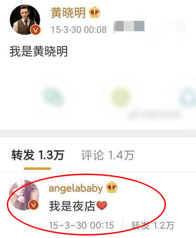 Cụ thể, vào tháng 5/2015, Huỳnh Hiểu Minh lộ ảnh đi hát karaoke, xung quanh là các cô gái xinh đẹp. Chuyện này đã khiến hình tượng của nam diễn viên bị ảnh hưởng không nhỏ. Sau đó, Huỳnh Hiểu Minh đã lên Weibo viết: "Tôi là Huỳnh Hiểu Minh", đáng chú ý, dưới phần bình luận, Angela Baby đã nhắn: "Còn tôi chính là hộp đêm".