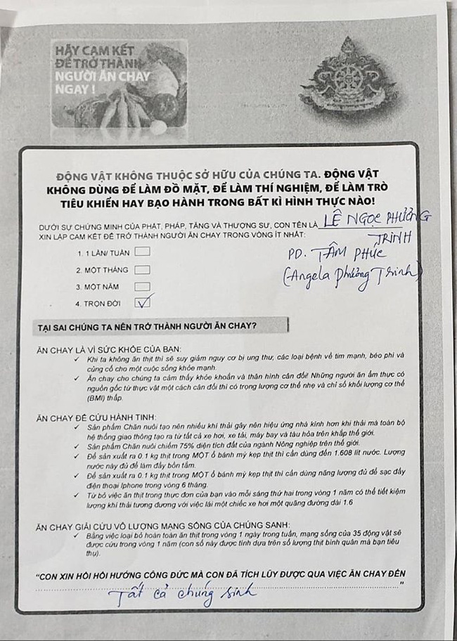 Trong tuyên bố của mình, Angela Phương Trinh tâm sự về quyết định này của mình: "Hôm qua, ngày 1/1 /2020. Con đã phát nguyện ăn chay trọn đời với sự tu tập hạnh từ bi, niềm tin sâu vào Nhân - Quả, tôn trọng mạng sống, tình thương yêu đối với chúng sanh theo tinh thần của người con Phật.