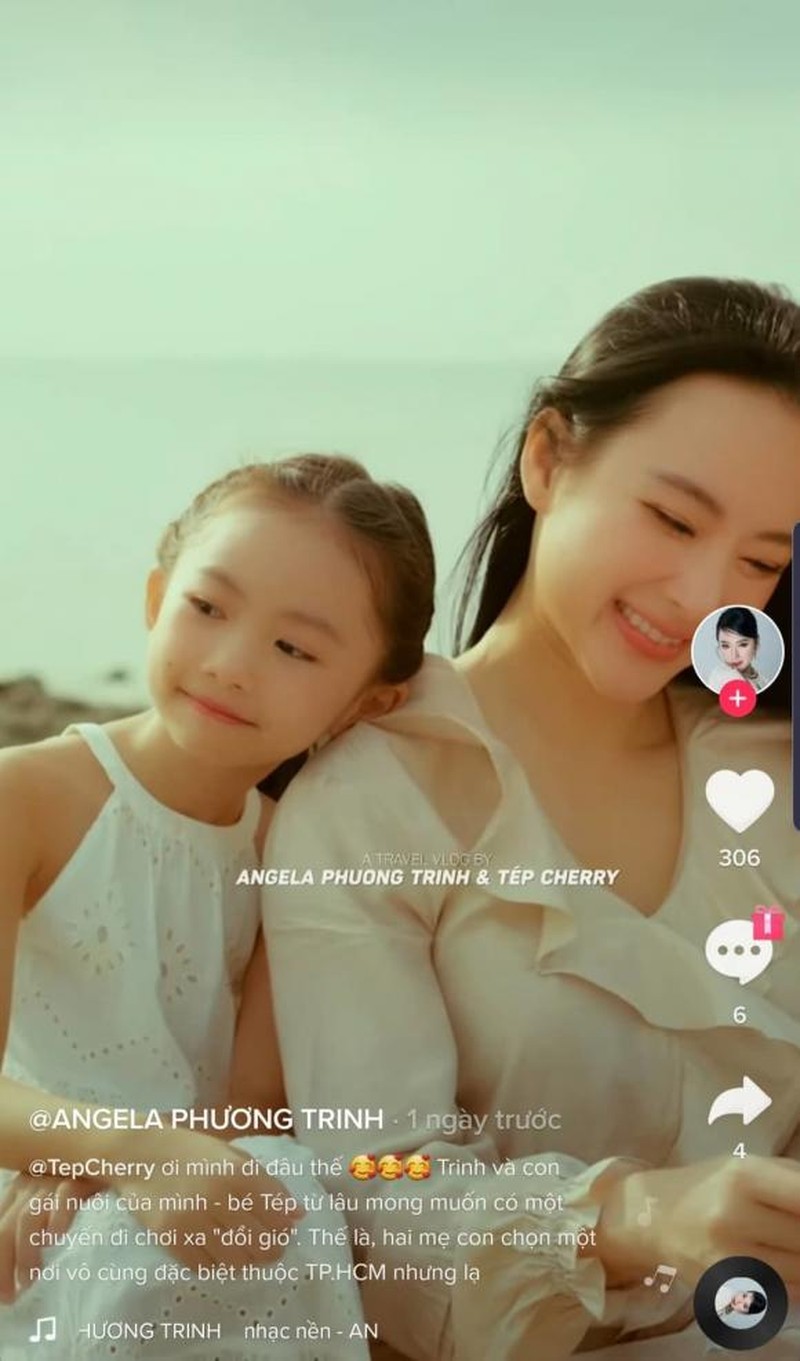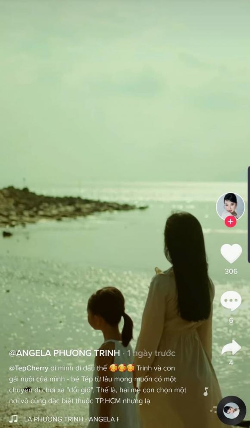 Mới đây, trên trang TikTok cá nhân của mình, Angela Phương Trinh đã đăng tải một đoạn clip công khai mình có "con nuôi". Cô chia sẻ: "Trinh và con gái nuôi của mình - bé Tép từ lâu mong muốn có một chuyến đi chơi xa "đổi gió". Thế là, hai mẹ con chọn một nơi vô cùng đặc biệt thuộc TP.HCM nhưng lại có biển, rừng và sông. Mọi người có đoán ra đâu không? đó là Cần Giờ, nơi mà không có nhà máy, xí nghiệp, không có khói bụi nên không khí trong lành.