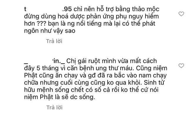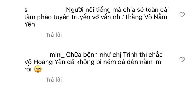 Chính vì vậy, nhiều cư dân mạng đã để lại bình luận chỉ trích cô là quá mê muội, nhận thức sai và không nên chia sẻ điều vớ vẩn như vậy. Thậm chí, có người còn nhắc đến cả Võ Hoàng Yên: "Người nổi tiếng mà chia sẻ toàn cái tầm phào, tuyên truyền vớ vẩn như thằng Võ Nằm Yên", "Chữa bệnh như chị Trinh mà khỏi được thì chắc Võ Hoàng Yên đã không bị ném đá đến nằm im rồi",...