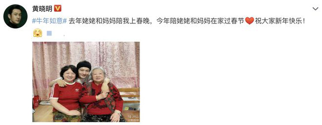 Cụ thể, trên trang cá nhân, ông xã Angelababy chia sẻ hình ảnh bản thân chụp chung hình bên cạnh bà và mẹ ruột trong tiệc đón Giao thừa năm mới Tân Sửu của gia đình. Huỳnh Hiểu Minh tiết lộ rằng, năm nay anh đón Giao thừa bên cạnh gia đình.