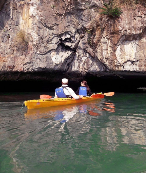 Angelina Jolie và Brad Pitt tự chèo thuyền kayak đi thăm Vịnh. Cặp vợ chồng nổi tiếng đến Việt Nam nhưng không đưa các con đi cùng. |