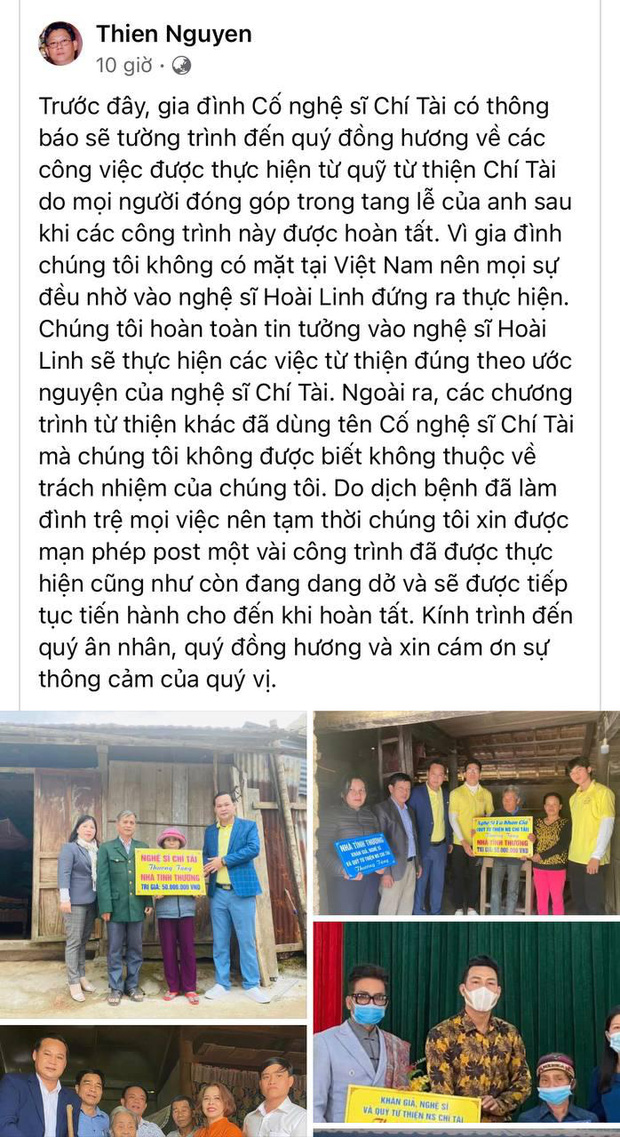 Ngoài ra, NS Chí Thiện cũng đứng ra bênh vực và giải thích lý do NS Hoài Linh công khai việc làm thiện nguyện chậm trễ là vì ảnh hưởng của dịch bệnh: "Do dịch bệnh đã làm đình trệ mọi việc nên tạm thời chúng tôi xin được mạn phép post một vài công trình đã được thực hiện cũng như còn đang dang dở và sẽ được tiếp tục tiến hành cho đến khi hoàn tất".