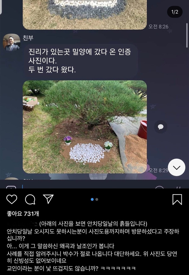 Người anh trai sau đó đã đăng tải loạt ảnh chứng minh những bức ảnh mà bố mình gửi không phải do chính ông chụp: "Ông có thể thấy vết cát được dùng trong đám tang ở ngay bức ảnh thứ 2. Vậy là ông đang cố nói với tôi rằng ông đã dùng ảnh của người khác để nói dối về việc ông thăm mộ Sulli vào hôm đó à? Đây có phải là chi tiết 'bóp méo' mà ông đang nói đến không? Tôi xin dành cho ông một tràng pháo tay vì đã tự giải thích tình huống này. Bức ảnh thứ nhất trông còn chẳng đáng tin một chút nào. Ông không xấu hổ hay sao?".