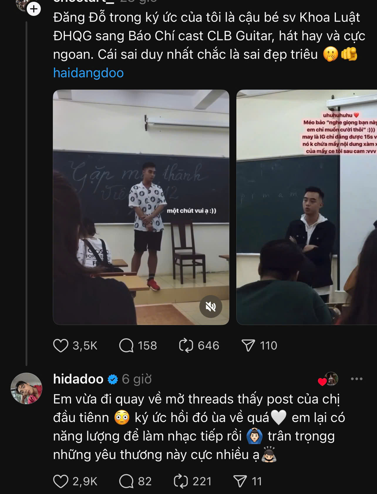 Sau đó, Hải Đăng Doo đã để lại bình luận: "Em vừa đi quay về mở Threads thấy bài đăng của chị đầu tiên. Ký ức hồi đó ùa về quá. Em lại có năng lượng để làm nhạc tiếp rồi. Trân trọng những yêu thương này cực nhiều ạ".