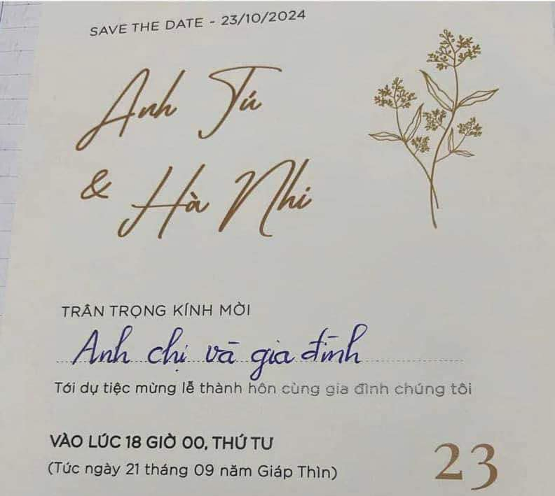 Trong tấm thiệp cưới mà Anh Tú chia sẻ, buổi tiệc đãi khách đã được diễn ra vào tối 23/10 ở Hà Nội và tên cô dâu là Hà Nhi. Anh Tú còn đính kèm dòng trạng thái: "Cảm ơn mọi người đã tới. Ai có thể tag hàng xóm tôi vào được không. Nay không thấy mặt mũi đâu".