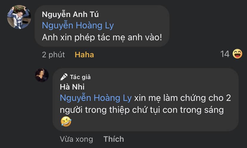 Bên dưới bài đăng, cư dân mạng rôm rả bình luận và ai cũng phải bó tay trước chiêu trò lầy lội của Anh Tú. "Cô dâu" bất đắc dĩ Hà Nhi cũng không bỏ qua cuộc vui và chia sẻ về trang cá nhân. Lúc này, Anh Tú hài hước nhắc LyLy vào bài đăng, gọi nữ ca sĩ là "mẹ" và nhờ chứng hôn cho đôi tân lang tân nương Anh Tú - Hà Nhi. Đáp lại, Hà Nhi tự chứng minh trong sạch với "cô hàng xóm" của Anh Tú: "Xin mẹ làm chứng cho 2 người trong thiệp chứ tụi con trong sáng".
