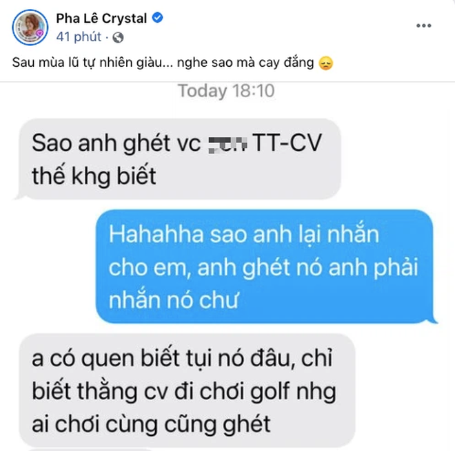 Tối ngày 15/9, sau khi Công Vinh đứng ra cùng vợ giải quyết drama sao kê thì Pha Lê cũng có động thái khiến cõi mạng dậy sóng. Nữ ca sĩ kể có người đã vào thẳng trang cá nhân của chồng người Hàn để mách chuyện: "Vợ anh bị Công Vinh bỏ nên giờ còn hận. Sống bên anh mà vẫn nhớ người yêu cũ, xen vào đời sống người ta".