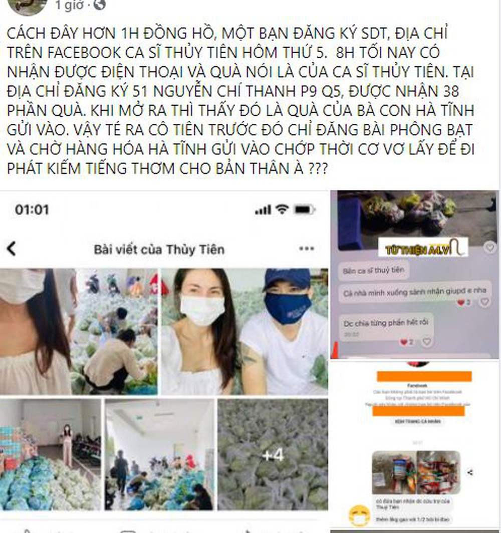 Trong bài "bóc", người này viết: "Một bạn đăng ký số điện thoại, địa chỉ trên Facebook ca sĩ Thủy Tiên hôm thứ năm. 8 giờ tối nay (tối thứ bảy) có nhận được điện thoại và quà nói là của ca sĩ Thủy Tiên. Tại địa chỉ đăng ký 51 Nguyễn Chí Thanh, phường 9 quận 5, nhận được 38 phần quà.