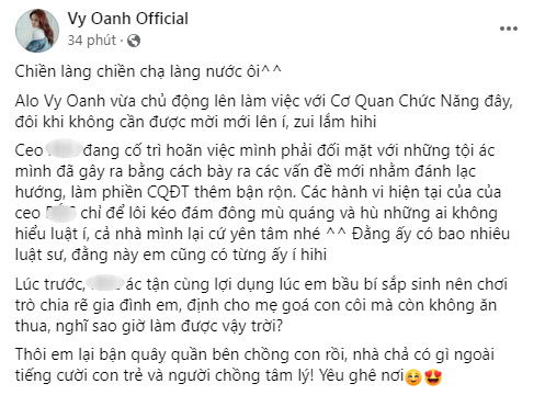 Nữ ca sĩ viết trên trang cá nhân: "Chiền làng chiền chạ làng nước ôi! Vy Oanh vừa chủ động lên làm việc với cơ quan chức năng đây, đôi khi không cần được mời mới lên, vui lắm.