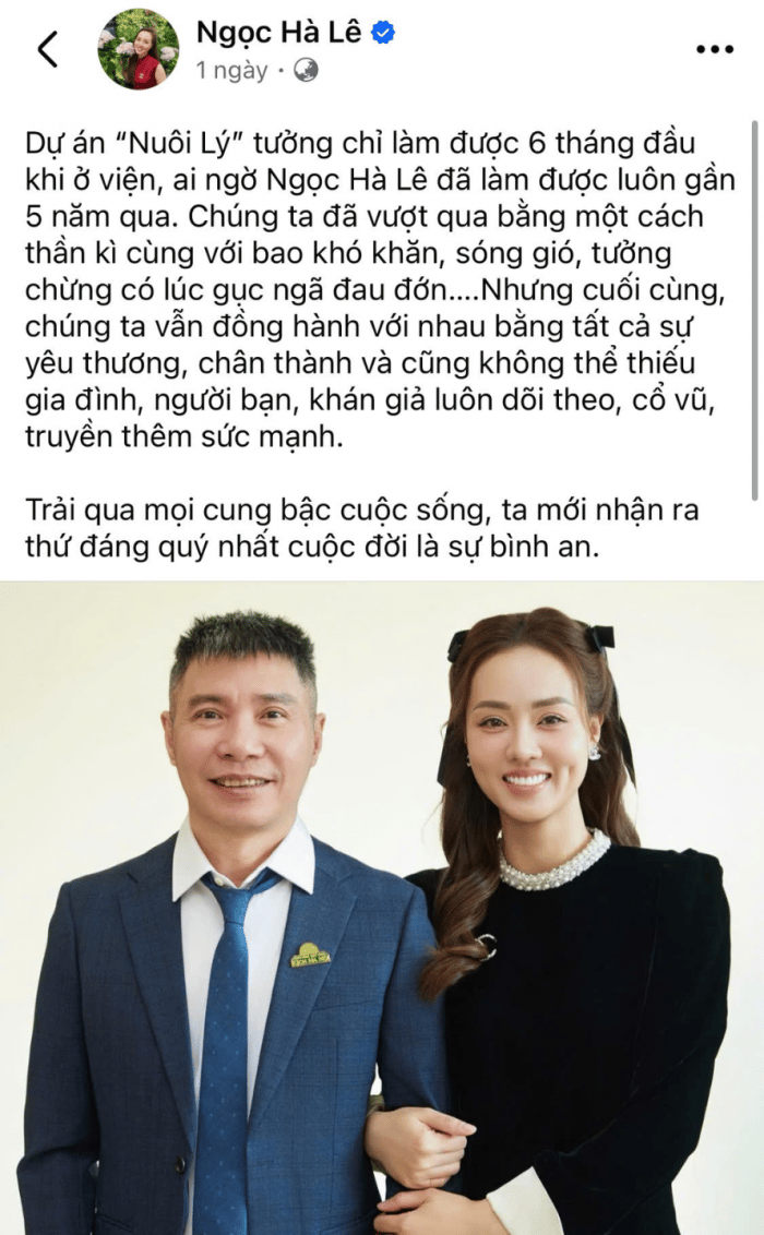 Cô viết: "Tưởng chỉ làm được 6 tháng đầu khi ở viện, ai ngờ Ngọc Hà Lê đã làm được luôn gần 5 năm qua. Chúng ta đã vượt qua bằng một cách thần kì cùng với bao khó khăn, sóng gió, tưởng chừng có lúc gục ngã đau đớn. Nhưng cuối cùng, chúng ta vẫn đồng hành với nhau bằng tất cả sự yêu thương, chân thành và cũng không thể thiếu gia đình, người bạn, khán giả luôn dõi theo, cổ vũ, truyền thêm sức mạnh. Trải qua mọi cung bậc cuộc sống, ta mới nhận ra thứ đáng quý nhất cuộc đời là sự bình an".