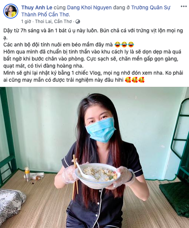 Thuỷ Anh cho biết không chỉ phòng ốc sạch sẽ, gọn gàng mà tại đây cô còn được tiếp tế đồ ăn rất chu đáo. Để lưu giữ lại những kỷ niệm trong 14 ngày này, Thuỷ Anh còn hứa hẹn sẽ quay Vlog và sớm chia sẻ với khán giả. "Dậy từ 7h sáng và ăn 1 bát ú ụ này luôn. Bún chả cá với trứng vịt lộn mọi người ạ. Các anh bộ đội tính nuôi em béo mầm đây mà. Hôm qua mình đã chuẩn bị tinh thần vào khu cách ly là sẽ dọn dẹp mà quá bất ngờ khi bước chân vào phòng. Cực sạch sẽ, chăn mền gấp gọn gàng, quạt mát, có tivi đàng hoàng nha. Mình sẽ ghi lại nhật ký bằng 1 chiếc Vlog, mọi người nhớ đón xem nha. Không phải ai cũng may mắn có được trải nghiệm này đâu", Thuỷ Anh viết.