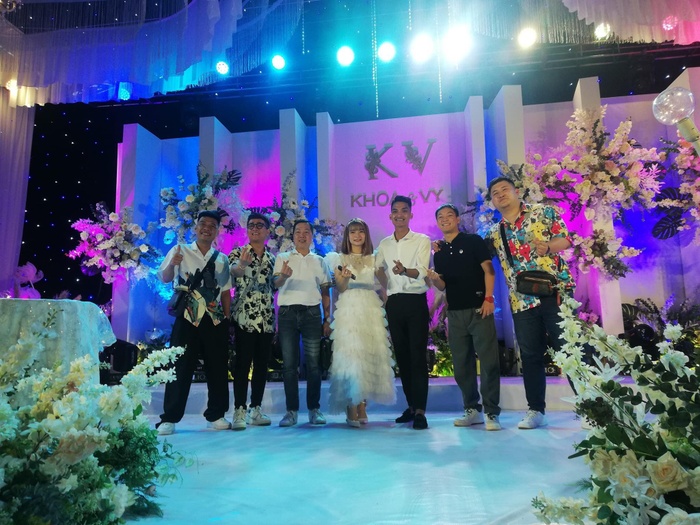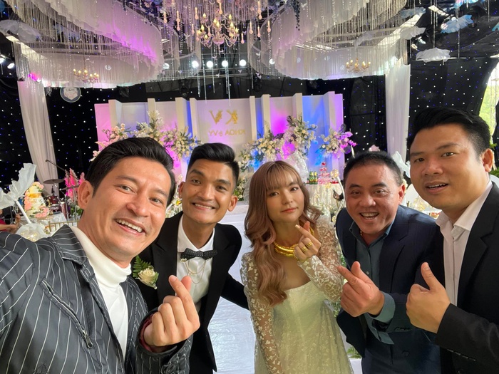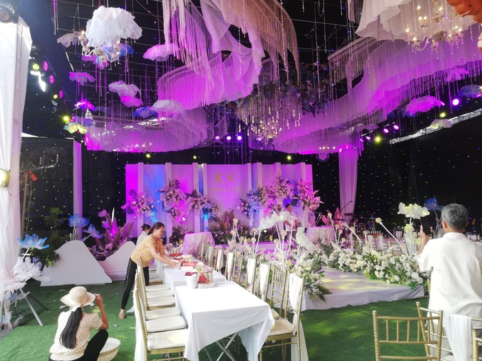Không gian tiệc cưới trang hoàng lộng lẫy, phủ hoa khắp nơi cùng ánh sáng lung linh. Với cơ ngơi hơn 300m2 ở quê, khung cảnh tiệc cưới được dựng không khác gì một nhà hàng 5 sao sang chảnh. Ngoài ra, dàn khách mời toàn siêu phẩm như: Danh hài Chiến Thắng, vợ chồng Lâm Vỹ Dạ, cầu thủ Văn Toàn,...