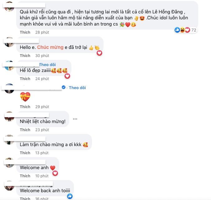 Bên dưới bài viết của Hồng Đăng, bà xã Anh Đào và rất nhiều bạn bè, người hâm mộ đồng loạt gửi lời chúc mừng đến anh: "Ổn chứ, về mạnh khỏe là ổn nhé", "Mạnh khỏe là ok rồi anh ạ, chào mừng anh đã trở lại", "Quá khứ rồi cũng qua đi, hiện tại, tương lai mới là tất cả. Cố lên, khán giả vẫn luôn hâm mộ tài năng diễn xuất của bạn. Chúc idol luôn luôn mạnh khỏe, vui vẻ và mãi luôn bình an trong cuộc sống", "Làm trận chào mừng anh ơi"...