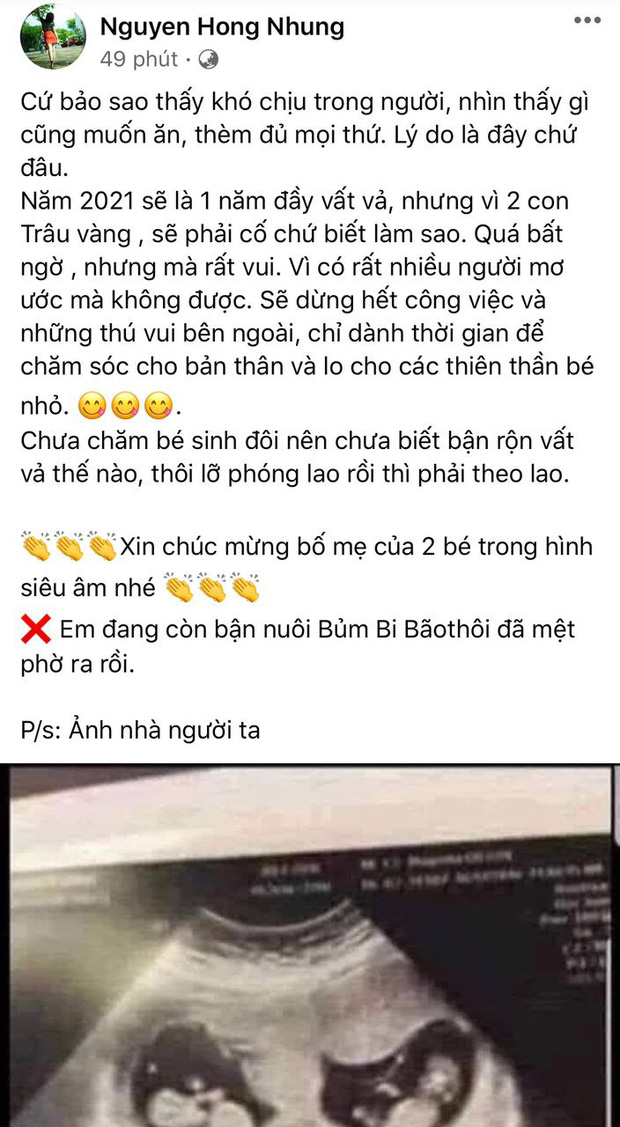 "Xin chúc mừng bố mẹ của 2 bé trong hình siêu âm nhé! Em đang còn bận nuôi Bủm Bi Bão thôi đã mệt phờ ra rồi. P/S: Ảnh nhà người ta", bà xã Xuân Bắc viết.