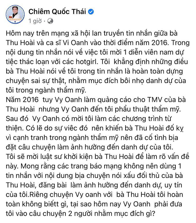 Trên trang cá nhân, bác sĩ Chiêm Quốc Thái khẳng định tin đồn trên là hoàn toàn sai sự thật. Do Hoa hậu Thu Hoài và anh có sự cạnh tranh trong kinh doanh nên cô đã dựng chuyện, bôi xấu hình ảnh của bác sĩ này. Chiêm Quốc Thái cũng cho biết đã mời luật sư để xử lý vụ việc này.