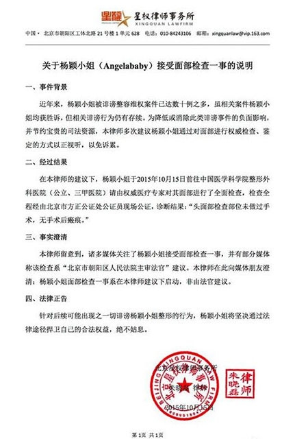 Bên cạnh đó, luật sư đại diện của Angela Baby trong văn bản pháp luật chính thức đăng tải trên Weibo ngày hôm qua có nhấn mạnh một điều: "Sau này, nếu có người mỉa mai hoặc có các hành vi phỉ báng cô Angela Baby phẫu thuật thẩm mỹ, Angela Baby sẽ thông qua pháp luật để bảo vệ quyền và lợi ích hợp pháp của mình, quyết không dung thứ".