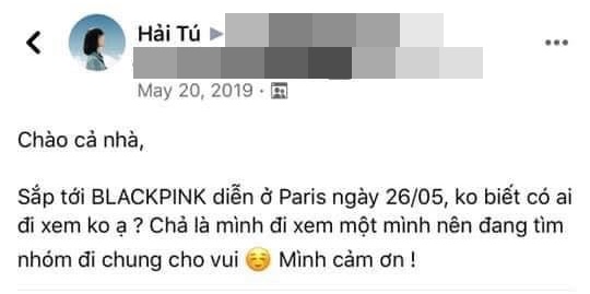 Mới đây, dân tình đã "đào mộ" lại một bài đăng cũ của Hải Tú với nội dung rủ người đi xem concert BLACKPINK. Có thể thấy nữ diễn viên độc quyền của công ty Sơn Tùng M-TP cũng là một người hâm mộ nhóm nhạc nữ đình đám K-pop.