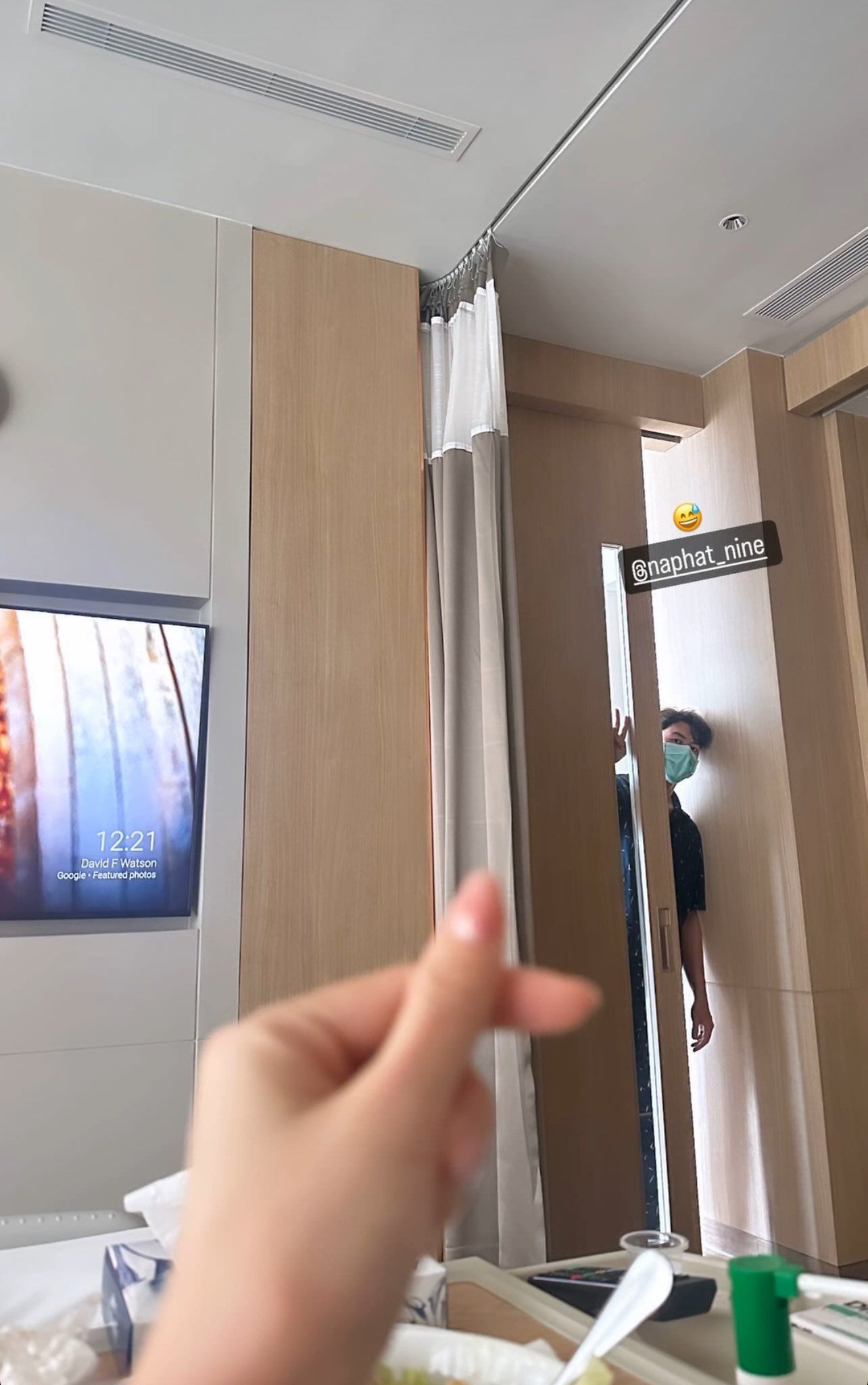 Nine Naphat ngay lập tức đến chăm sóc Baifern. Anh chàng bịt khẩu trang và giơ chữ V nhìn vào giường bệnh bạn gái. Trong khi Baifern cũng gửi “mini heart” để cảm ơn bạn trai đã đến chăm sóc mình. Tình cảm ấm áp của cặp đôi khiến netizen không khỏi ngưỡng mộ