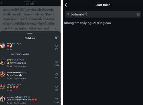 Đặc biệt, Baifern cũng không hề có bất cứ tương tác gì về bài đăng gây chú ý trên của Nine Naphat. Trước đó, theo một nguồn tin trong nước, mẹ Nine Naphat không thích Baifern Pimchanok. Thời điểm cả hai công khai mối quan hệ, mẹ Nine Naphat đã "unfollow" trang cá nhân của Nine Naphat và Baifern Pimchanok. Nam diễn viên cũng thay vị trí quản lý của mẹ bằng một người khác.