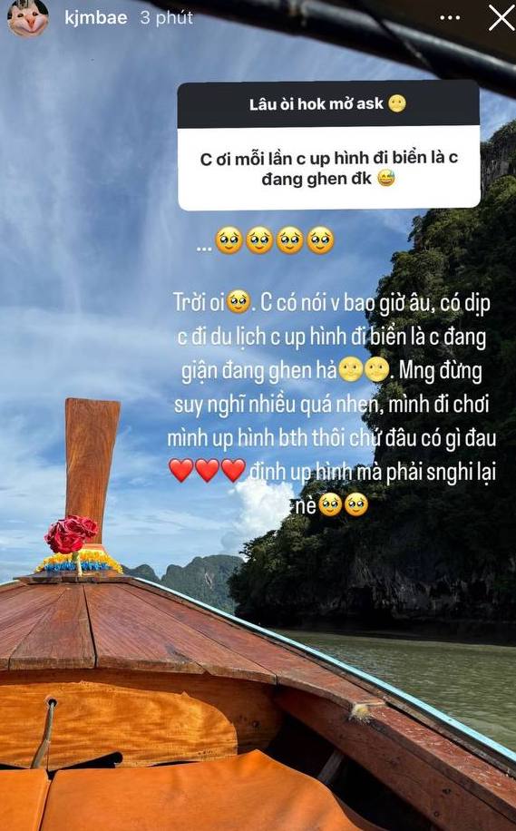 Tuy nhiên, Mỹ Hàn bày tỏ vì có dịp đi du lịch nên đăng hình chứ không đồng nghĩa là đang giận hay đang ghen. Mỹ nhân 2k3 cũng nhắn nhủ: “Mọi người đừng suy nghĩ nhiều quá nhen, mình đi chơi mình đăng hình bình thường thôi chứ không có gì đâu”.