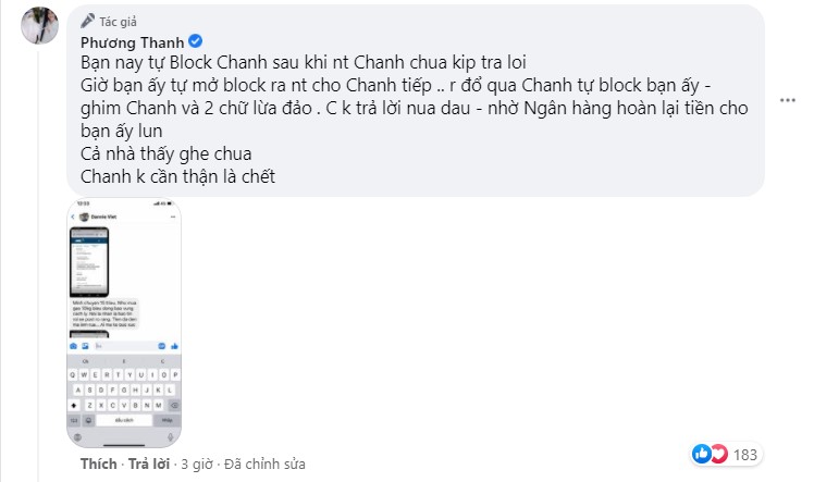 Mới đây, Phương Thanh vừa đăng đàn tỏ rõ thái độ bức xúc khi bị một khán giả nói mình lừa đảo tiền từ thiện. Theo đó, tài khoản có tên D.V đã nhắn tin cho Phương Thanh và thông báo rằng anh vừa chuyển khoản tiền ủng hộ chống dịch vào ngày 28/7, nữ ca sĩ cũng khẳng định khi nào nhận được tiền sẽ báo lại. Tuy nhiên, Phương Thanh cho biết cả ngày hôm qua cô bận đi phát gạo từ thiện, lúc đó bên ngân hàng điện thoại báo có tiền từ Úc gửi về nên nữ ca sĩ phải ra ký tên mới có thể nhận được tiền. Cho đến nay, cô lại phải gấp rút vào bệnh viện dã chiến hỗ trợ nên chưa thể đến ngân hàng ký giấy xác nhận. Vì thế, D.V cho rằng Phương Thanh lừa đảo và nhắn tin xúc phạm cô.