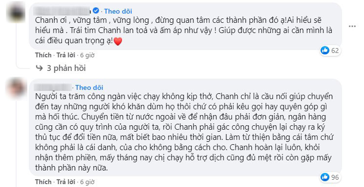 "Chị Chanh" bức xúc: "Sáng nay Chanh lại vào bệnh viện dã chiến vẫn chưa đi ký tên được, thì Chanh vẫn chưa đi nhận tiền được, cũng không và chưa biết bạn gửi bao nhiêu luôn. Trên Fanpage nhiều người nhắn tin hỗ trợ gạo và chuyển khoản tiền nhờ Chanh mua gạo chứ không phải một mình bạn này mà giờ xúc phạm Chanh. Chanh vừa gọi cho ngân hàng, Chanh không đi ký tên nữa mà hoàn tiền lại luôn, khỏi nhận nữa".