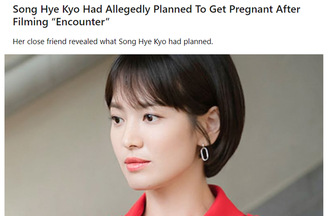 Thông tin trên được tiết lộ bởi chính một người bạn thân trong ngành giải trí với Song Hye Kyo. “Cô ấy nói rằng cô ấy sẽ chuẩn bị mang thai sau khi Encounter kết thúc”, người bạn của Song Hye Kyo tiết lộ.