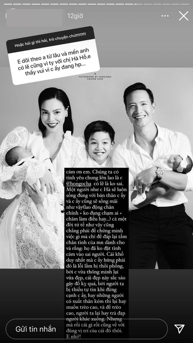 Cụ thể, người em thân thiết của Hồ Ngọc Hà viết: "Một người như chị Hà sẽ luôn sống đúng với bản thân chị ấy và chị ấy cũng sẽ sống mãi như vậy (lao động chân chính, không đụng chạm ai, chăm làm điều hay...). Cả một đời tử tế như vậy cũng không phải để chứng minh việc gì mà chỉ để đáp lại tấm chân tình của mọi người dành cho và rằng họ đã không đặt sai người.