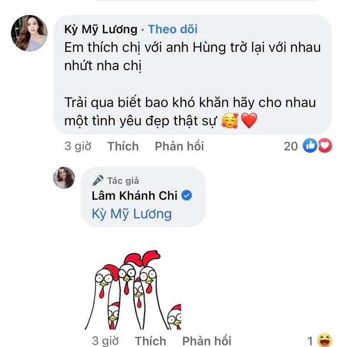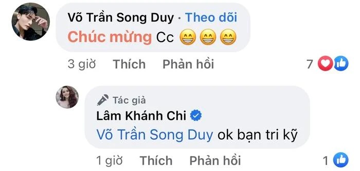 Một trong những bình luận gây chú ý nhất là của Võ Trần Song Duy. Theo đó, nam diễn viên đã nhanh chóng bình luận: "Chúc mừng chị". Sau đó, Lâm Khánh Chi cũng đã trả lời lại: "Ok, bạn tri kĩ"