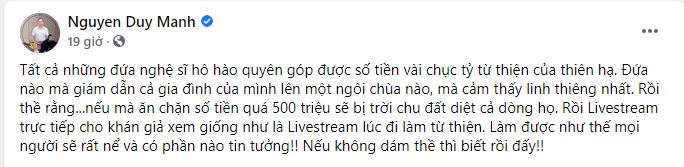 Cũng bày tỏ quan điểm về vấn đề này, ca sĩ Duy Mạnh viết trên trang cá nhân: "Tất cả những đứa nghệ sĩ hô hào quyên góp được số tiền vài chục tỷ từ thiện của thiên hạ. Đứa nào mà dám dẫn cả gia đình của mình lên một ngôi chùa nào, mà cảm thấy linh thiêng nhất. Rồi thề rằng...nếu mà ăn chặn số tiền quá 500 triệu sẽ bị trời chu đất diệt cả dòng họ. Rồi livestream trực tiếp cho khán giả xem giống như là livestream lúc đi làm từ thiện. Làm được như thế mọi người sẽ rất nể và có phần nào tin tưởng!Nếu không dám thề thì biết rồi đấy!".