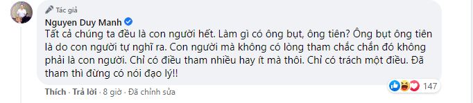 Duy Mạnh còn chia sẻ thêm: "Tất cả chúng ta đều là con người hết. Làm gì có ông bụt, ông tiên? Ông bụt ông tiên là do con người tự nghĩ ra. Con người mà không có lòng tham chắc chắn đó không phải là con người. Chỉ có điều tham nhiều hay ít mà thôi. Chỉ có trách một điều. Đã tham thì đừng có nói đạo lý!".