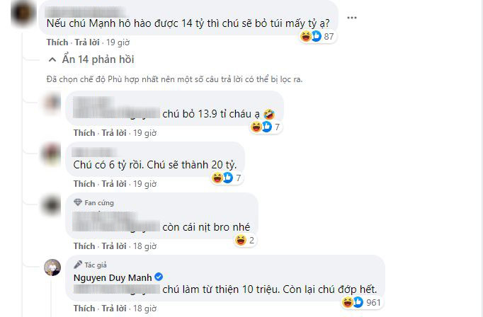 Cụ thể, khi một netizen bình luận dưới bài đăng của Duy Mạnh rằng: "Nếu chú Mạnh hô hào được 14 tỷ thì chú sẽ bỏ túi mấy tỷ ạ?", nam ca sĩ đã nhanh chóng phản hồi: "Chú làm từ thiện 10 triệu, còn lại chú đớp hết".