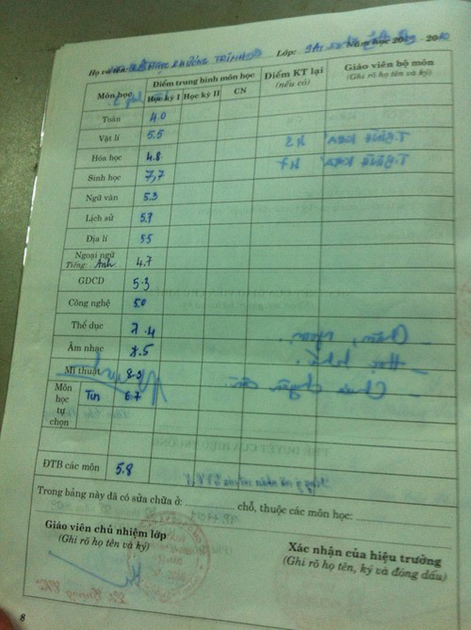 Nổi tiếng từ nhỏ với những vai diễn ấn tượng, tuy nhiên, Angela Phương Trinh lại gây xôn xao khi bỏ học từ năm lớp 9. Không những thế, bảng điểm không mấy "đẹp đẽ" của cô nàng cũng bị rò rỉ. Trong đó, nữ diễn viên chỉ nhận được điểm trung bình cho hầu hết những môn học.