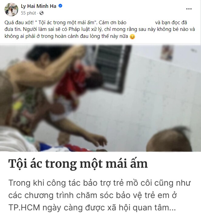 Trên trang fanpage, Minh Hà - bà xã Lý Hải chia sẻ lại hình ảnh, video tại mái ấm H.H. Là mẹ 4 con, cô bày tỏ sự bức xúc: "Quá đau xót! 'Tội ác trong một mái ấm'. Cảm ơn báo và bạn đọc đã đưa tin. Người làm sai sẽ có pháp luật xử lý, chỉ mong rằng sau này không bé nào và không ai phải ở trong hoàn cảnh đau lòng thế này nữa".
