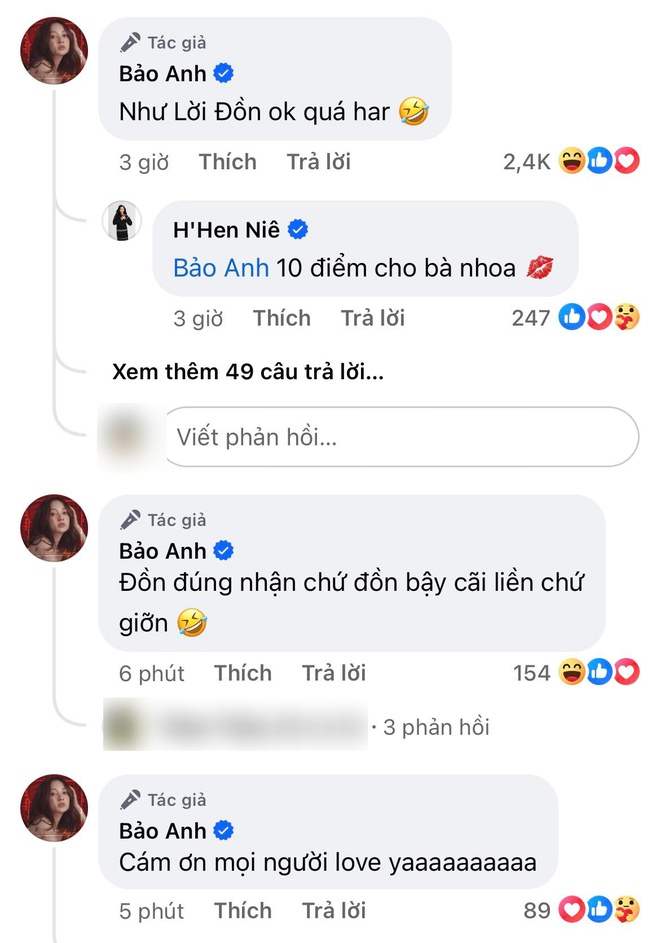 Đặc biệt, giữa lúc cư dân mạng đồng loạt soi lại những hint bầu bí và nhắc về tin đồn sinh con từng bị lan truyền khắp các diễn đàn vào đầu năm 2023, Bảo Anh cũng có phản ứng gây chú ý. Theo đó, nữ ca sĩ không hề tỏ ra khó chịu hay bức xúc mà còn hài hước đáp trả: "Như lời đồn ok quá ha. Đồn đúng thì nhận chứ đồn bậy cãi liền chứ giỡn".