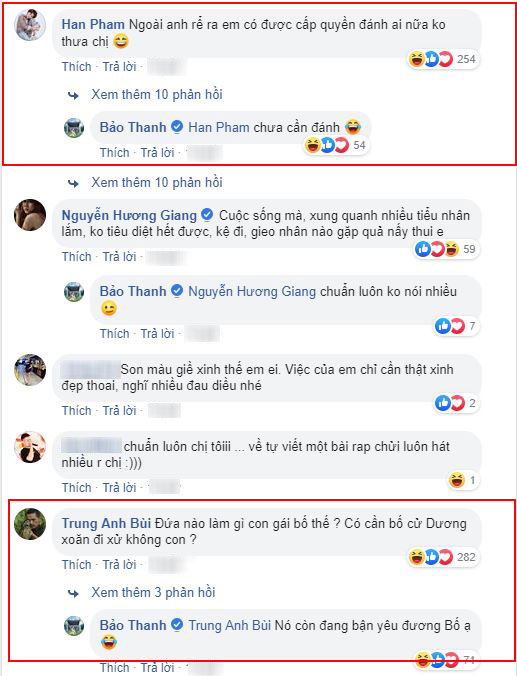 Bên dưới bài đăng, dàn diễn viên "Về nhà đi con" ngay lập tức vào an ủi cô nàng Thư "Xính Lao". "Bố Sơn" hùng hổ: "Đứa nào làm gì con gái bố thế? Có cần bố cử Dương xoăn đi xử không con?". Còn Ánh Dương "tomboyloichoi" thì nhanh nhảu: "Ngoài anh rể ra, em có được cấp quyền đánh ai nữa không thưa chị?", Bảo Thanh chốt lại: "Chưa cần đánh".