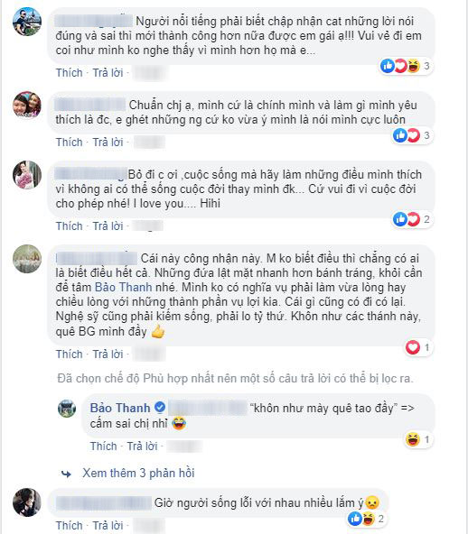 Bên cạnh đó, rất nhiều người hâm mộ cũng vào động viên Bảo Thanh không nên để ý những lời ong tiếng ve của thiên hạ bởi đời nghệ sĩ vốn phải chịu những điều tiếng không đáng có.