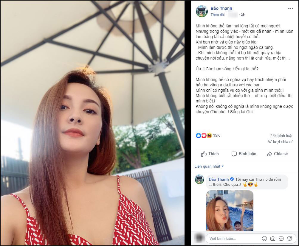 Trên trang cá nhân, diễn viên Bảo Thanh vừa đăng tải một dòng trạng thái khá bức xúc khi bị một số người đặt điều nói xấu, thậm chí chửi rủa và miệt thị cô chỉ vì nhờ vả mà cô không giúp được.