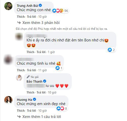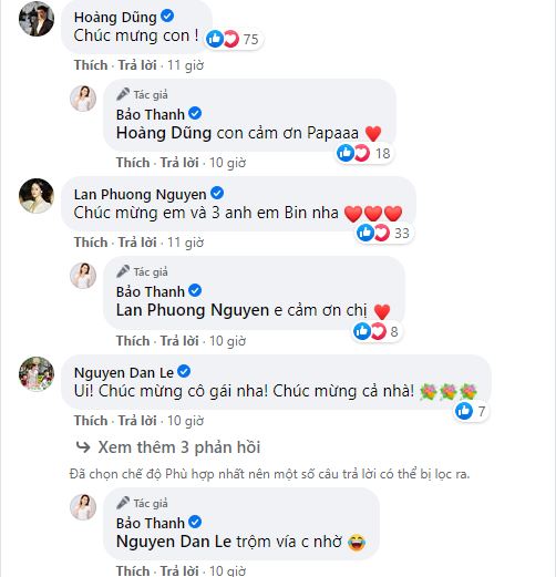 Trước bài đăng đầy hào hứng này, đông đảo bạn bè, người hâm mộ cũng như dàn sao Việt như NSND Hoàng Dũng, NSƯT Trung Anh, diễn viên Lan Phương, Đan Lê... đã nhanh chóng vào gửi lời chúc mừng tới Bảo Thanh.