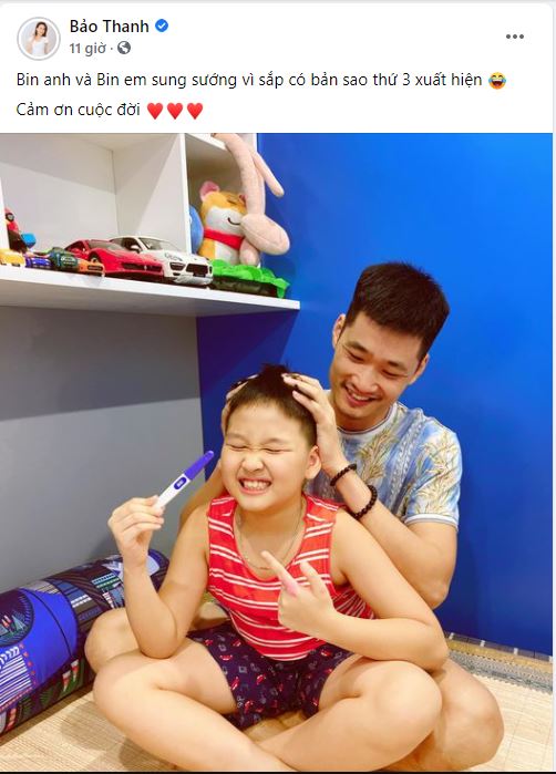 Cho đến mới đây, Anh Thư của "Về nhà đi con" đã chính thức xác nhận chuyện mang bầu bé thứ hai bằng một hình ảnh cực đáng yêu trên trang cá nhân. Theo đó, Bảo Thanh đăng tải khoảnh khắc chồng và con trai hạnh phúc bên que thử thai 2 vạch, đi kèm với đó là dòng chú thích: "Bin anh và Bin em sung sướng vì sắp có bản sao thứ 3 xuất hiện. Cảm ơn cuộc đời".